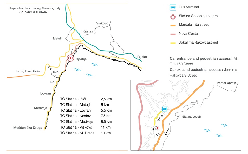 TC Slatina predstavlja jedni trgovački centar sa raznovrsnim sadržajima na području Opatije ali i susjednih općina Lovran i Mošćenička draga.